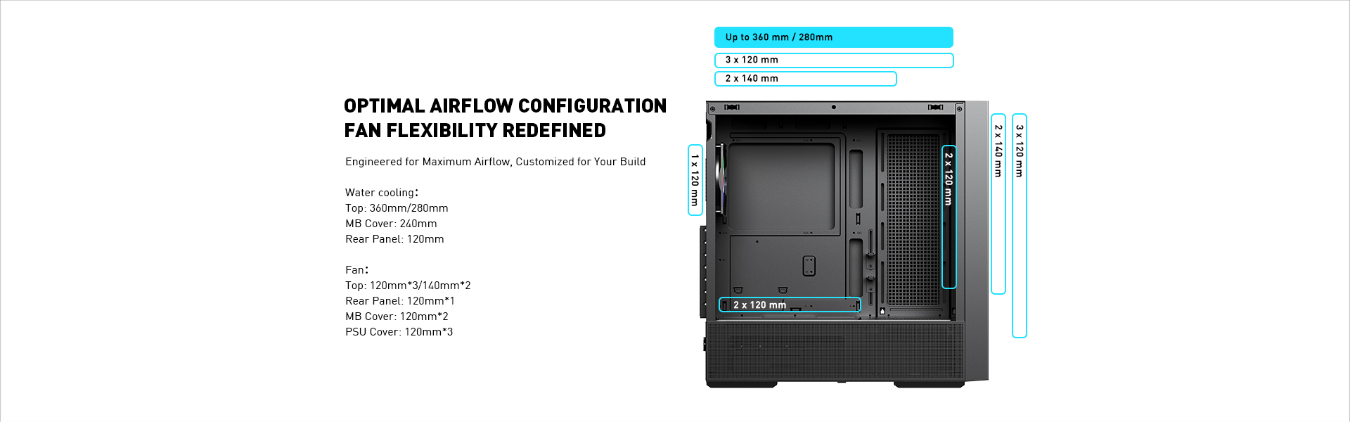 Front: 120mm x 3 or 140mm x 2 Top: 120mm x 3 or 140mm x 2 Rear: 120mm x 1 PSU Cover :120mm x 2 MB Cover :120mm x 2
